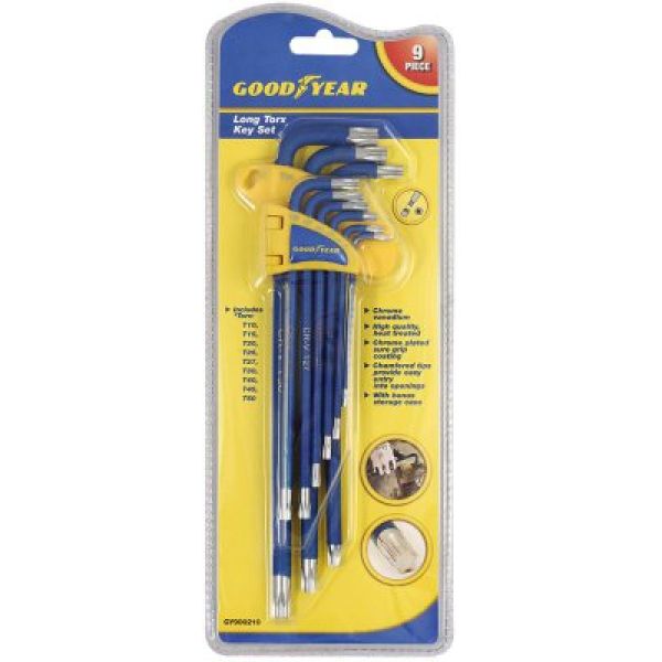 Sisaldab 9 pikka (78-221mm) Torx võtit.Suurused: T10, T15; T20; T25; T27; T30; T40; T45; T50. Võtmed on kaetud libisemiskindla... GOODYEARTootekood: 00210 Tarneaeg:Hetkel pole saadaval