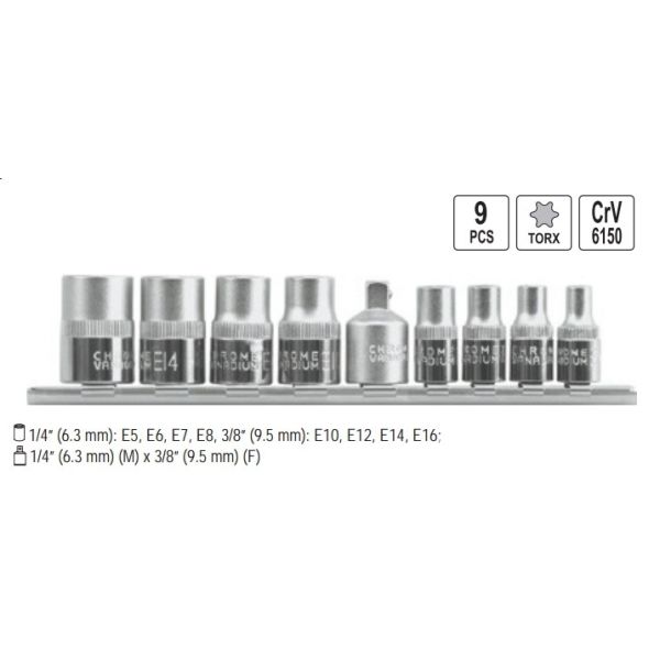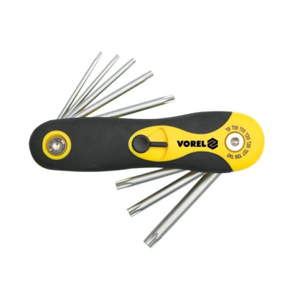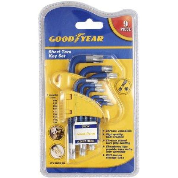 Sisaldab 9 lühikest (48-113mm) Torx võtit.Suurused: T10, T15; T20; T25; T27; T30; T40; T45; T50. Võtmed on kaetud libisemiskindla kattega. GOODYEARTootekood: 00220 Tarneaeg:Hetkel pole saadaval